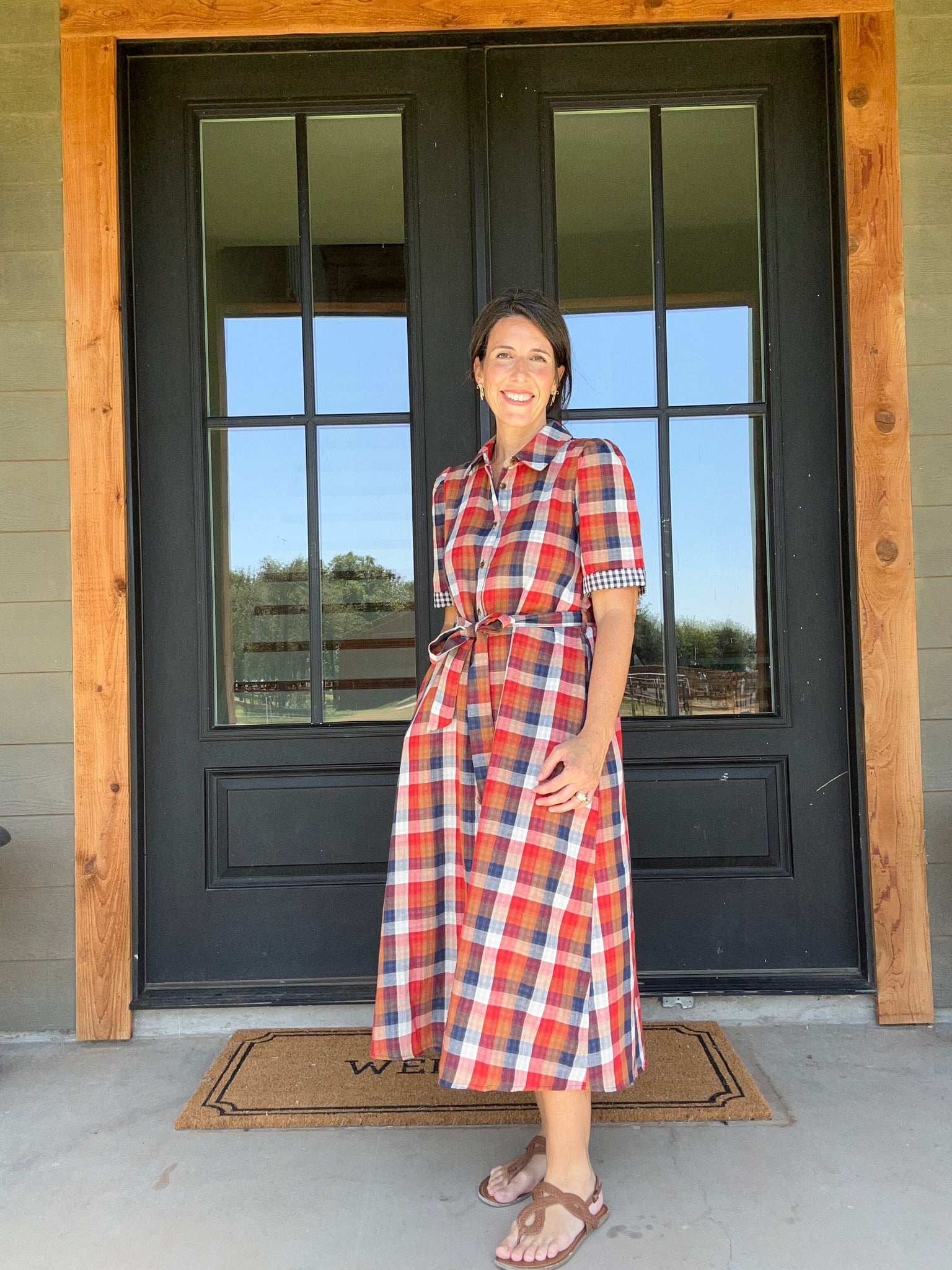 100% cotton, button up dress with sash (Optional if you like a dress that hangs straight). This dress has pockets and contrasting gingham detail! It's the perfect dress to take you into fall!